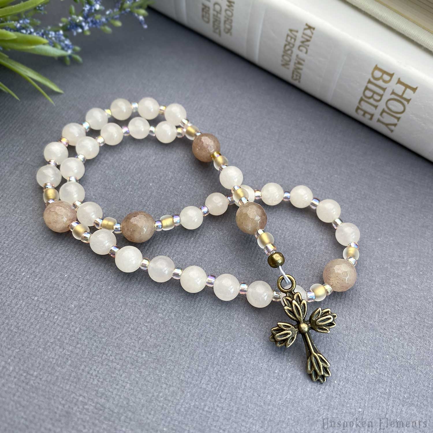 The Joyful Hope Prayer Beads are designed to reflect the brightness of a heart anchored in grace. Their soft pink tones and warm antique brass details speak to a faith that is tender, uplifting, and quietly radiant.