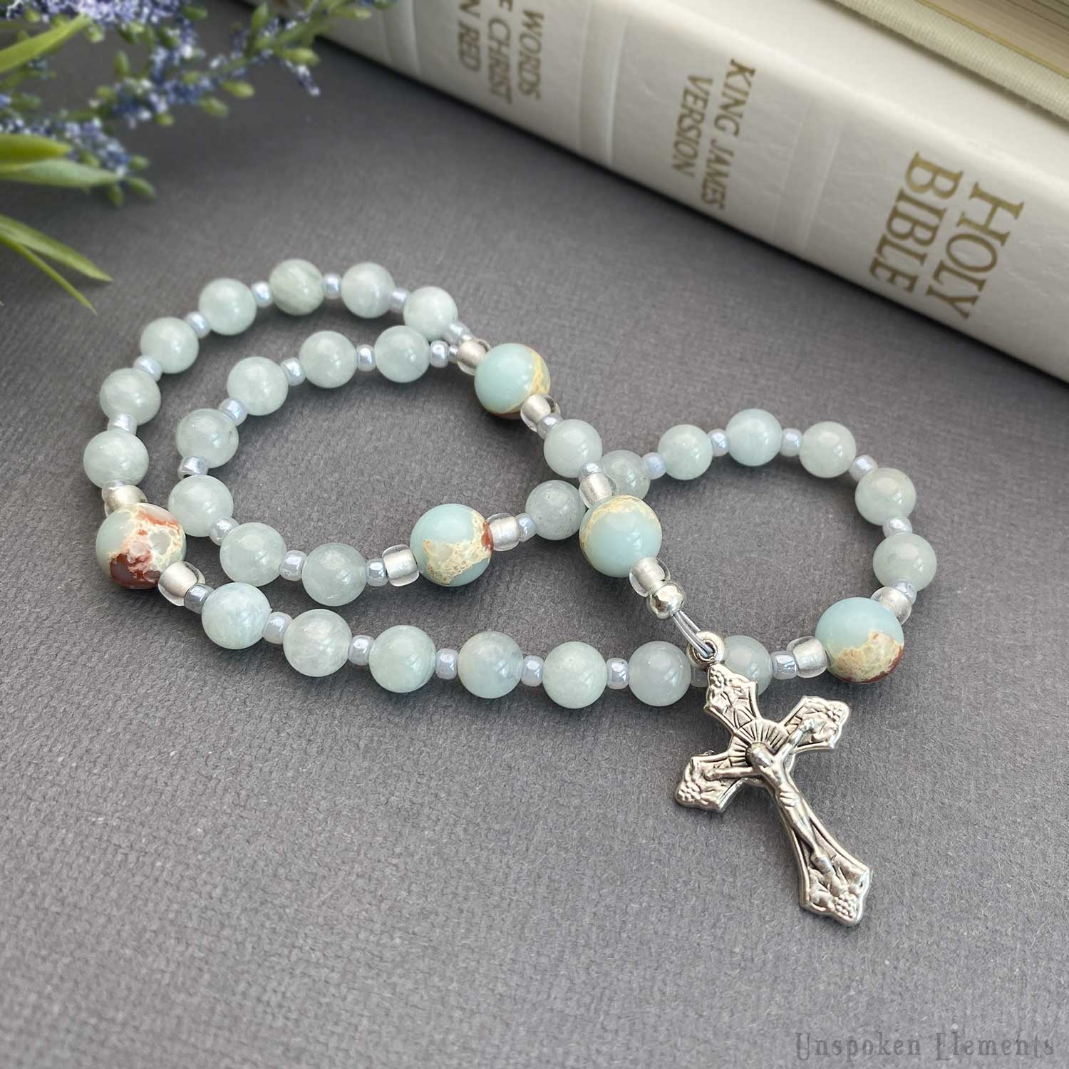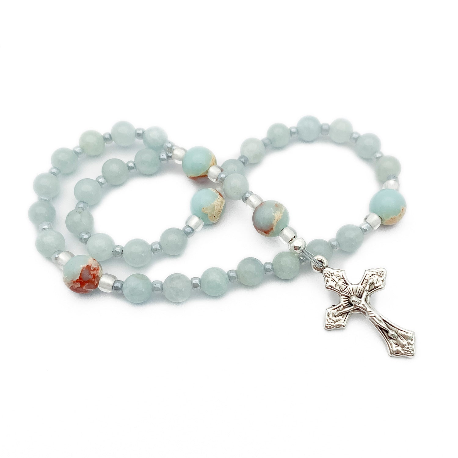 Featuring Aquamarine and Jasper, these Anglican prayer beads bring together two stones traditionally associated with serenity and strength. Aquamarine is often valued for its connection to courage and peaceful clarity, while Jasper symbolizes grounding and steady support.