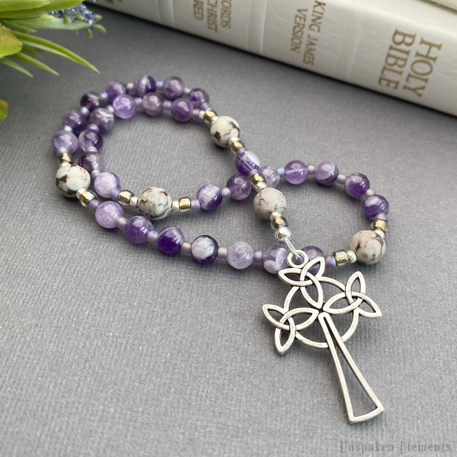 • Thoughtfully crafted with Amethyst and Fossil with a Triquetra style cross